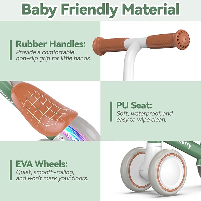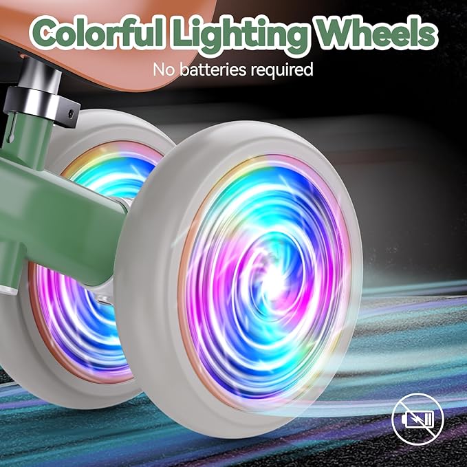 - Cool Light-up Wheel: Liberry toddlers balance bike features a flash-emitting design on its wheels. It emits colorful light while riding, adding to the fun of cycling. Whether indoors or outdoors, it will make infant the center of attention, boosting their confidence and joy. No batteries are required, just spin the wheels to glow