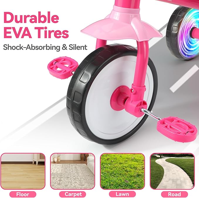 - OUTDOOR INDOOR RIDING: 3 wheels of our kids trike are made of EVA foam, which can be shock absorbing for outdoor riding and quiet for indoor riding, helping your child to improve riding skills and physical coordination regardless of location