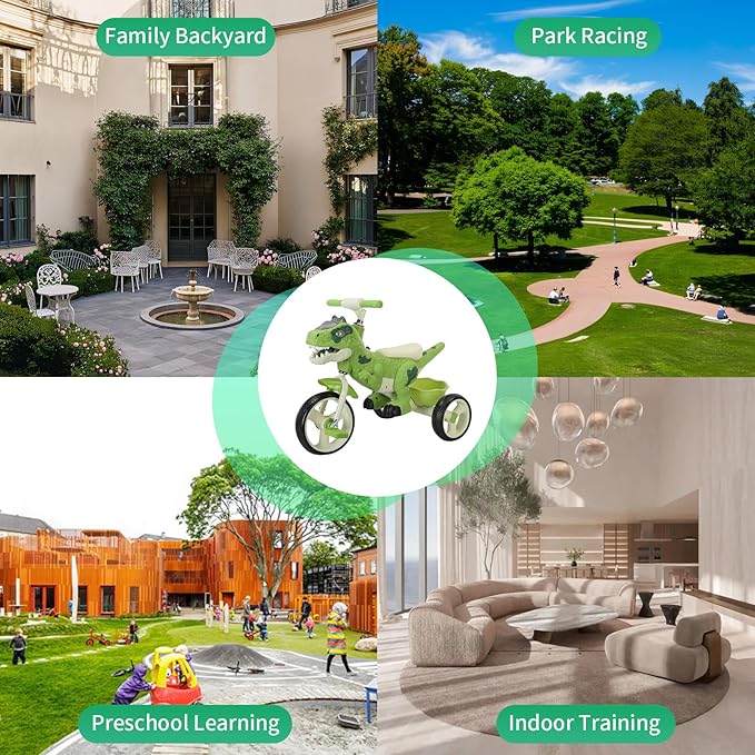 - The Dinosaur-Themed Kids Tricycle is perfect for your little one's adventures, featuring a STORAGE BASKET to keep their treasures close.