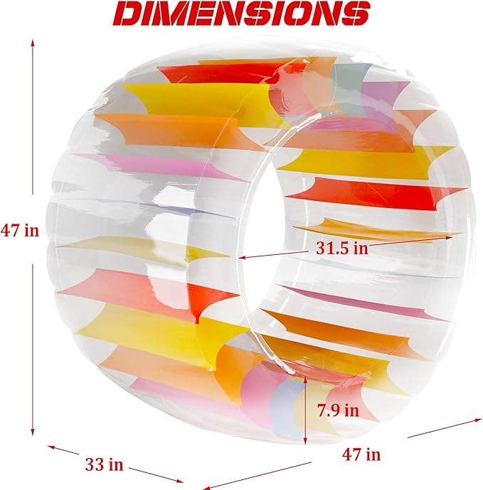 - EYE-CATCHING COLOR: Transparent shell with vibrant internal stripes creates mesmerizing visuals in sunlight. Generous size (47" outer diameter, 33" width) ensures hours of exciting play.
