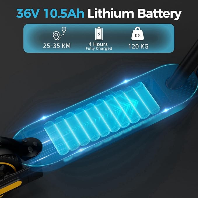 - ✅ Long Battery Life: Adult e-scooter is equipped with a large capacity 36V-10.5Ah battery, it takes 4-5 hours to be fully charged. E scooter can reach a maximum range of 22 miles. The battery undergoes strict quality control, it is safe and durable, can be recharged more than 1000 times.