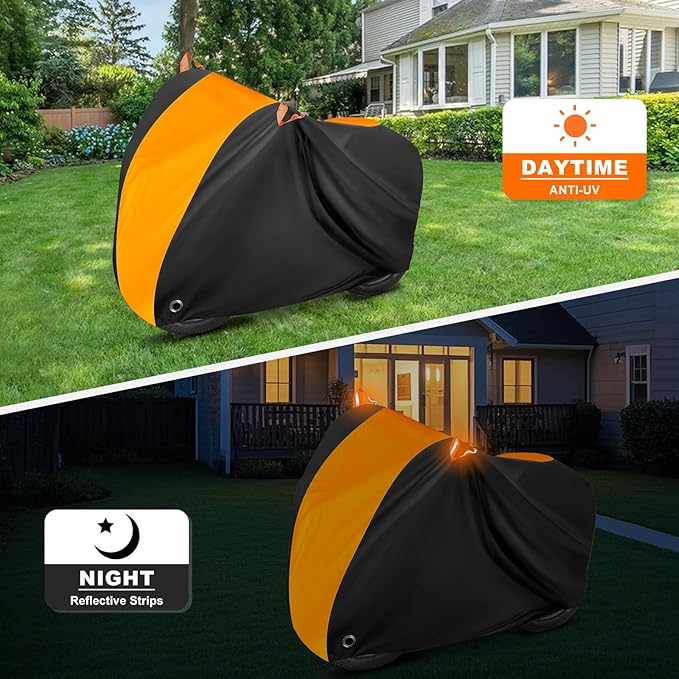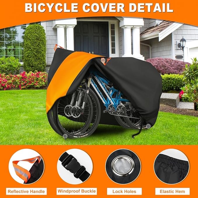 - Detailed Design - The front and rear locking holes of the bike cover allow you to use the lock at any time to protect your bike from theft, and the aluminum locking holes are more durable and less likely to damage the cover than the woven nylon ones. Two reflective strips on the front of the bike are designed to make it easy for you to find your vehicle at night, improve dark visibility and reduce the risk of collision