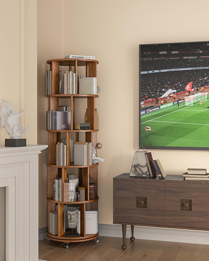 5-Tier Solid Wood Rotating Bookshelf on Wheels, 360° Spinning Book Shelf Tower, Round Revolving Bookcase Organizer, Rolling Bookshelves for Small Spaces, Corner, Bedroom, Kids Room, Office, Walnut