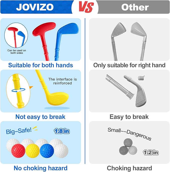 - HIGH-QUALITY & SAFE DESIGN: Jovizo toddler golf set is crafted from durable, baby friendly plastic with smooth edges to prevent injuries. The 1.8-inch golf balls are larger than standard, reducing choking risks and ensuring worry-free play for toddlers