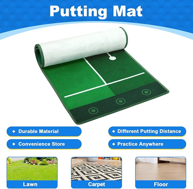 - GOLF ANYWHERE: Our kids golf clubs set with putting mat is suitable for outdoor and indoor. Kids can use mat in the living room, backyard, or park to practice golf according to different trajectories while boosting hand-eye coordination and patience