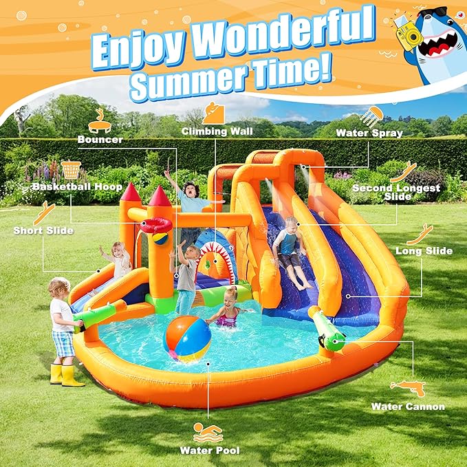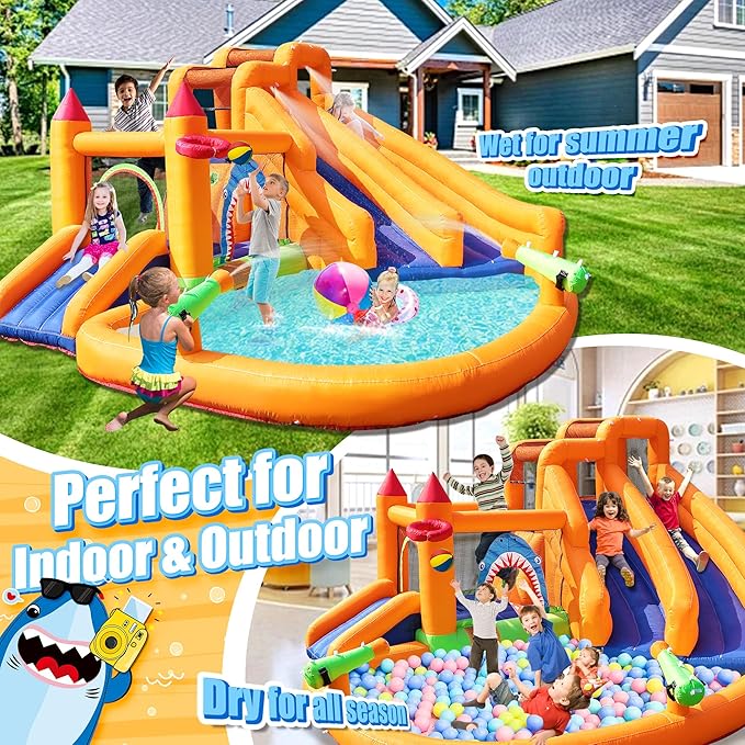 - 【10-in-1 water castle for endless fun】 The multifunctional water park features triple slides, double water guns, bouncer, basketball hoop, climbing wall, two sprayers, oversized pool for endless excitement and splashing adventures for your kids. The kids pool inflatable can be filled with water and ocean balls to make the party more fun than ever in summer.