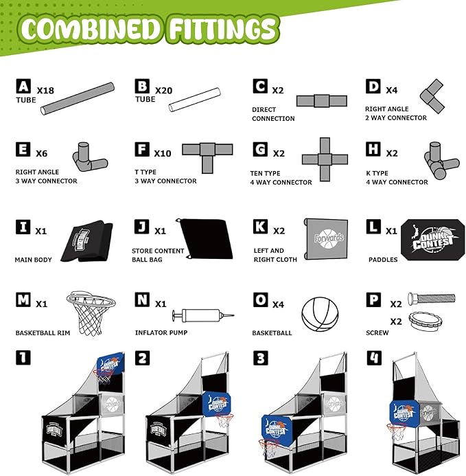 - Included Components : Basketball hoop, Basketball goal, 4 Basketballs, Air pump, Instruction manual