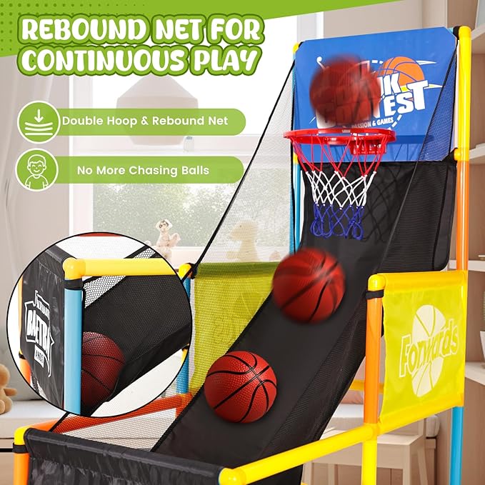 - [Rebound Net for Continuous Play]: With a design similar to classic arcade basketball games, this indoor basketball hoop for kids features a bounce-back net that automatically returns the ball after each shot. It keeps the pace fast and fun while minimizing cleanup