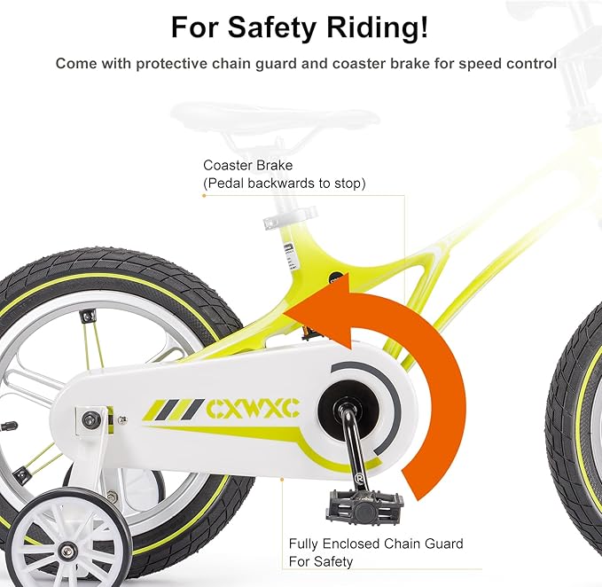 - 【Specifically For Kids】: Each bike equipped with sealed bearing for smooth pedaling. Training wheels come with 14/16/18 inch bikes, making it easy to maintain balance and learn to pedal even for young beginners. Every CXWXC bike seat is both easily adjustable and easy to lock down. You can adjust the height to fit your kid as they grow up with the bike. The chain guard fully enclosed well protects the chain, and your child will not get hurt when try to touch the chain.