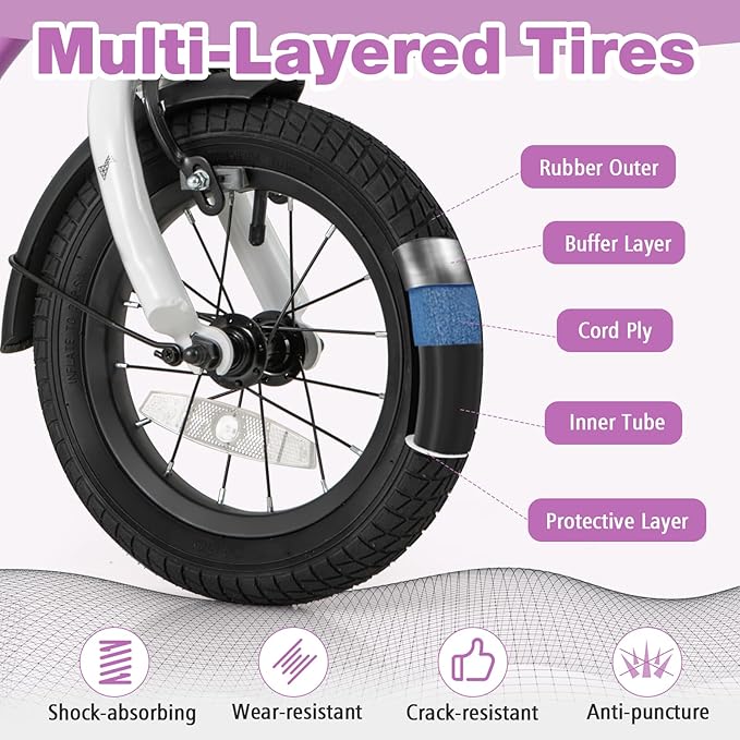 - High Quality Wheels for Riding: The kids bike is equipped with 2 shock-absorbing and crack-resistant rubber wheels for a smooth and safe riding experience. It also has 2 training wheels to help beginners keep balance and gain confidence. When not in use, the training wheels can be easily removed to let young riders enjoy riding fun.