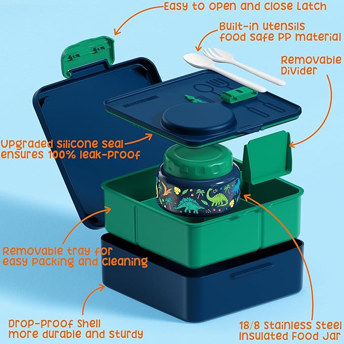 - 100% Leakproof Bento Box for Kids: Say goodbye to spills! Our patented middle lid locks in liquids with an upgraded silicone seal, ensuring 100% leak-proof while keeping forks and spoons neatly tucked away! And here's the kicker: kids lunch box with 3/4 compartments features removable dividers and individual silicone seals that keeps juices in and flavors pure. Bye-bye, food flavor mashups! Ideal for packed lunches whether you're hitting the classroom or the trail