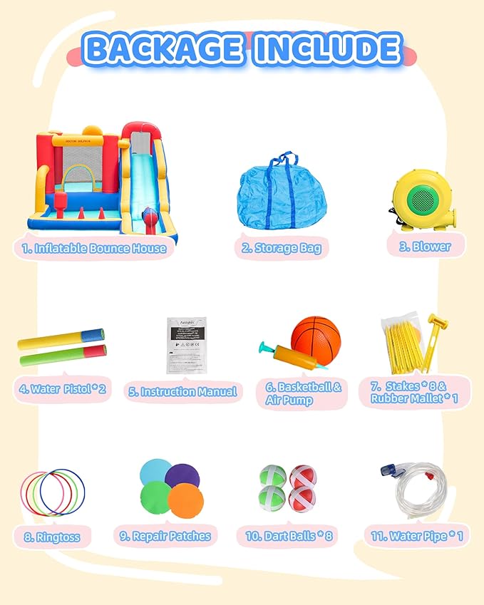- 【Quick and Easy Setup】Setting up this bouncy castle is quick and effortless, thanks to the included blower. Inflation takes minutes, and its simple deflation and packing process.