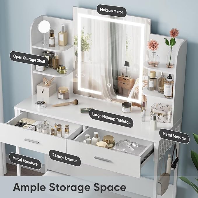 - Ample Storage Solution: This vanity table provides generous storage with three open shelves, metal side racks, and two deep drawers. It offers ample space for all your beauty essentials, keeping everything neatly organized and easily accessible.