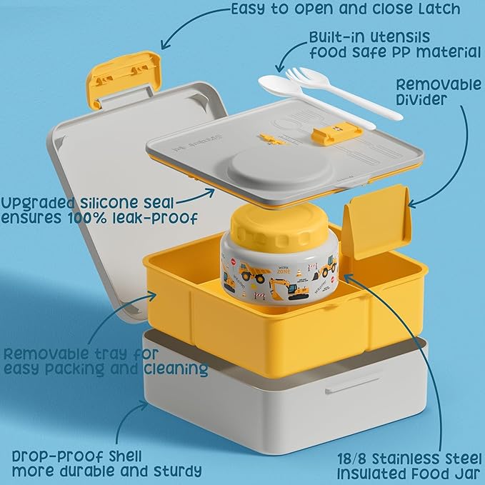 - KIDS-SAFE & ADULT-FRIENDLY DESIGN: Made from BPA-free, food-grade materials that are odorless & durable, Fimibuke kids lunch boxes for school is safe for children and hassle-free for adults. Child-friendly latches and a vent plug make the lid easy for small hands to open, while the lightweight shell and sturdy handle let kids carry it effortlessly. Portion-controlled compartments help adult stick to healthy portions, insulated jar for hot food allows you enjoy fresh meal, say goodbye to takeout