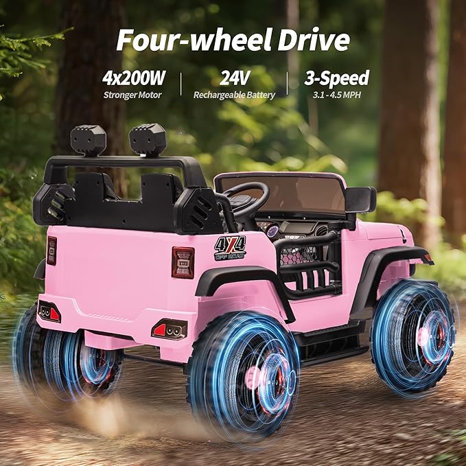 - Realistic Driving Experience: Thrill-seeking kids will love this 24V ride on toy! Packed with realistic features like working headlights, rear searchlights, built-in music player and battery level display, this electric car for kids ages 4-8 is built for imaginative outdoor adventures!