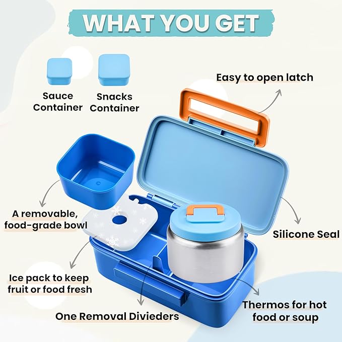 PIQUEBAR Kids Lunch Box with 8oz Thermo, Leakproof Bento Box with Insulated Bag, Kids Insulated Water Bottle, Food Lunch Container for Back to School Girls Boys, Blue