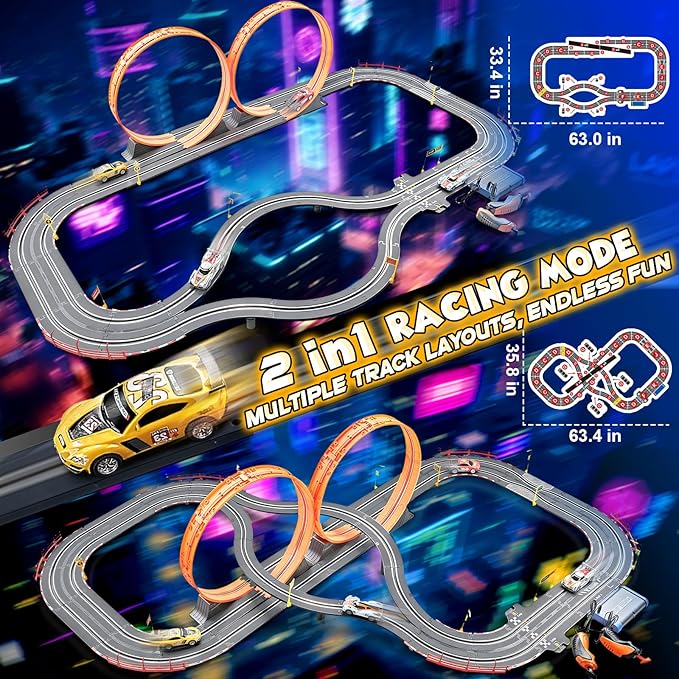 - Exciting Dual Racing Tracks:Our slot car race track sets simulates a variety of racing tracks, including simple straight tracks,curves tracks,360° circular staggered tracks and exciting double-layer overpass track,and automatic lap counting function also bring the coolest racing experience to the racers. We designed two distinct track layouts to offer multiple racing routes, allowing kids to customize their own racing adventures.