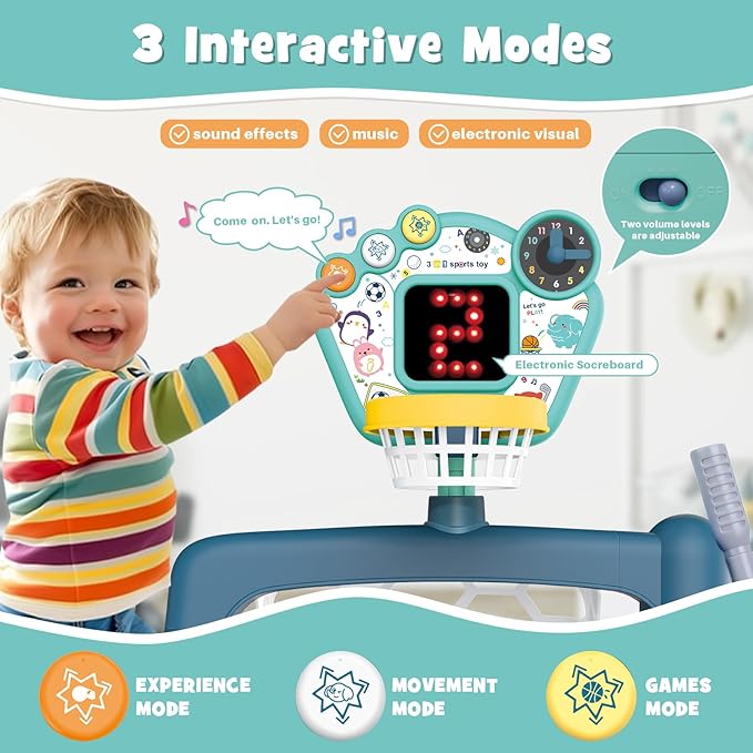 - Interactive LED Scoreboard & 3 Play Modes – basketball hoop for kids 1-3 features Game Mode (follow-along actions), Sports Mode (fun music and LED visuals), and Counting Mode (track scores while shooting hoops or kicking goals) for endless entertainment
