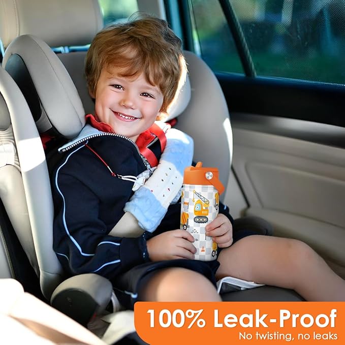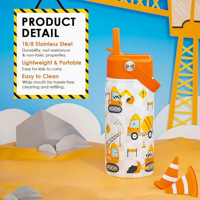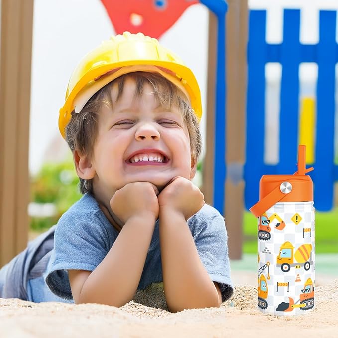 Construction Kids Water Bottle With Straw Lid 12oz Insulated Stainless Steel, Truck Travel Tumbler, Gifts For Boys, Birthday, Christmas, Back To School