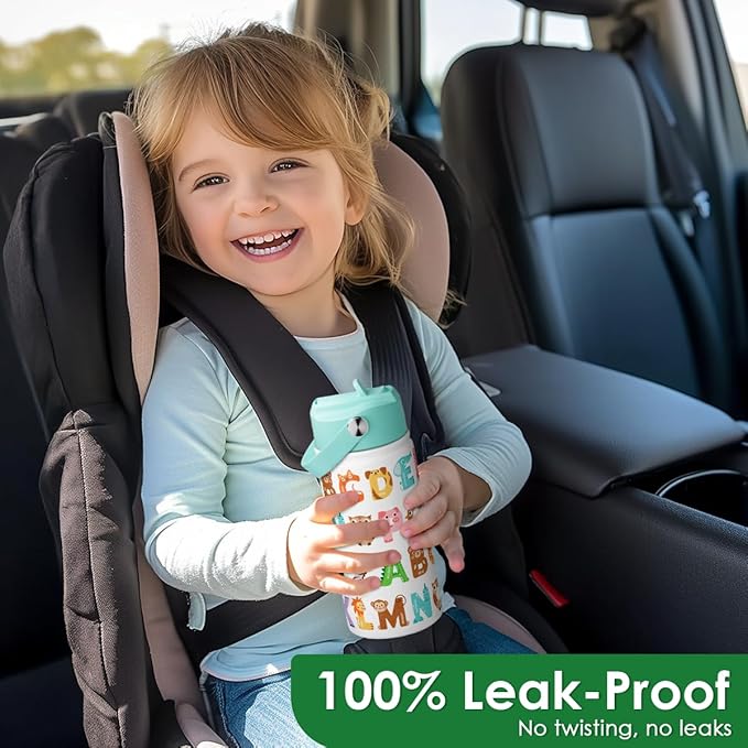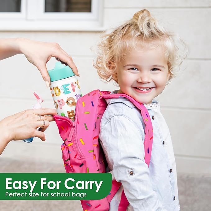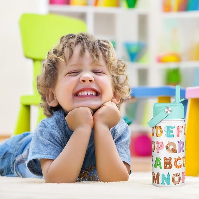 Alphabet Kids Water Bottle with Straw Lid 12oz Insulated Stainless Steel, Travel Tumbler, Animal Gifts for Boys Girls, Birthday, Christmas, Back to School