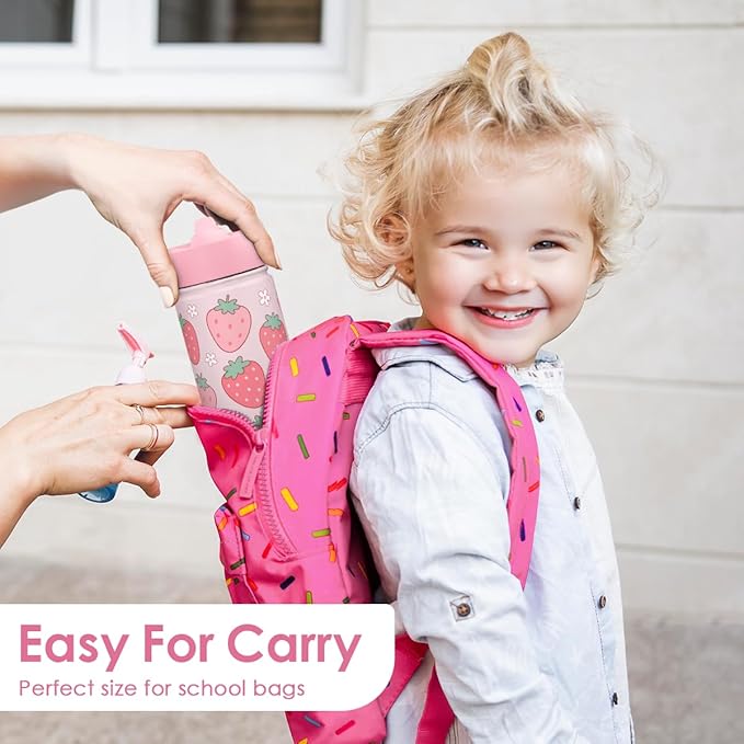Strawberry Kids Water Bottle with Straw Lid 12oz Insulated Stainless Steel, Travel Tumbler, Gifts for Girls, Birthday, Christmas, Back to School