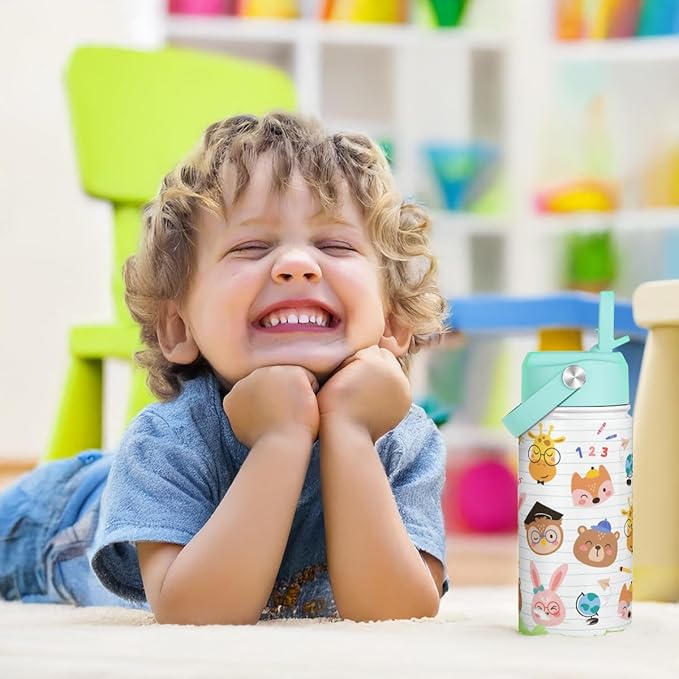 Animal Kids Water Bottle with Straw Lid 12oz Insulated Stainless Steel, Travel Tumbler, Gifts for Girls, Birthday, Christmas, Back to School