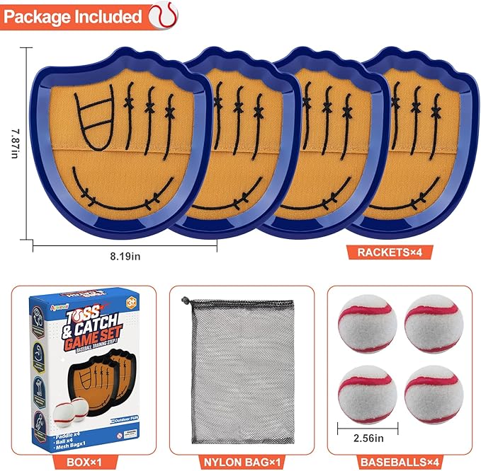 - Relive Childhood Memories with a Baseball Twist - Upgrade nostalgic fun with our premium baseball-themed toss & catch set! Paddles feature baseball glove design in durable plastic, while high-bounce deluxe balls. Perfect for backyard play, family bonding, and sports skill-building.