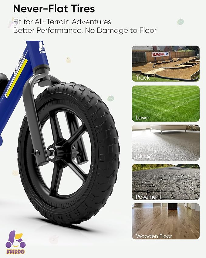 - ALL-TERRAIN TIRES FOR ADVENTURE– The 12-inch, puncture-proof tires work on all terrains: tracks, grass, carpets, pavements, and wood floors. Kids can enjoy outdoor fun without worrying about flat tires or scratching floors. Ideal for bikes for toddlers 2-3.