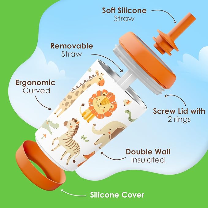 Kid Insulated Stainless Steel Tumbler with Silicone Straw, 12oz Sippy Cup for Kids (Jungle Animals)