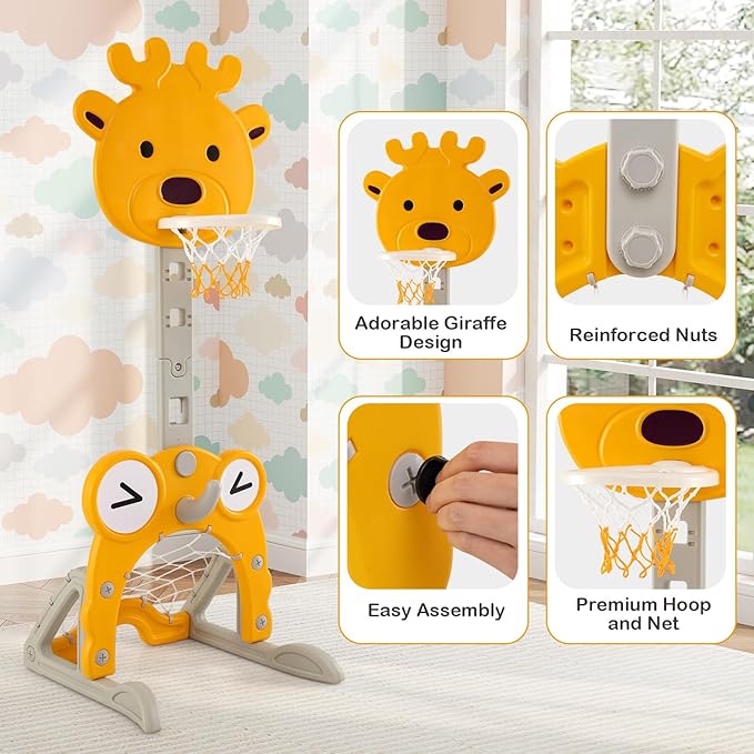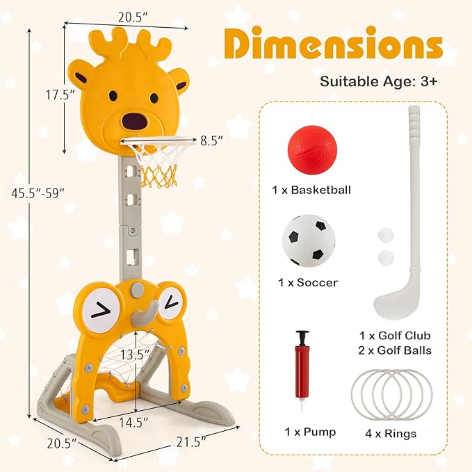Costzon Toddler Basketball Hoop, 4-in-1 Kids Sports Activity Center with Rim, Soccer Goal, Golf, Ring Toss, Height Adjustable Kids Basketball Hoop with Fillable Base for Indoor Outdoor (Yellow Deer)