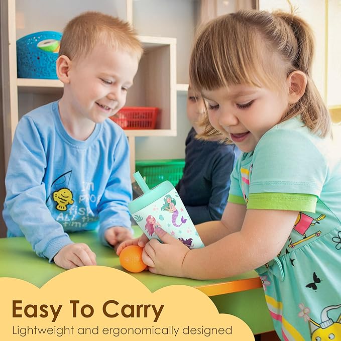 Kid Insulated Stainless Steel Tumbler with Silicone Straw, 12oz Sippy Cup for Kids (Magical Mermaids)