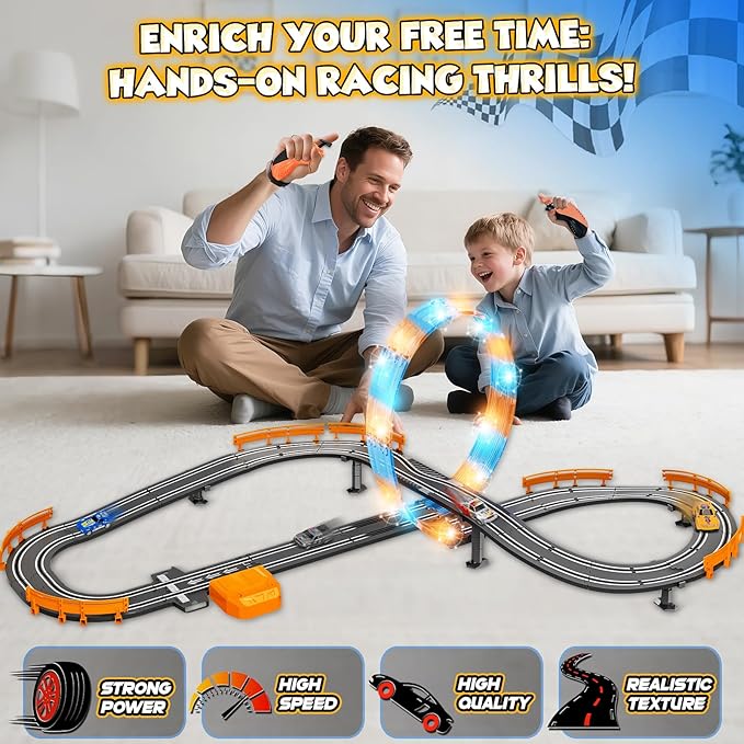 - Exciting Dual Racing Tracks:Our slot car race track sets simulates a variety of racing tracks, including simple straight tracks,curves tracks,360° circular staggered tracks and exciting double-layer overpass track,and automatic lap counting function also bring the coolest racing experience to the racers. We designed two distinct track layouts to offer multiple racing routes, allowing kids 6-8 to customize their own racing adventures.