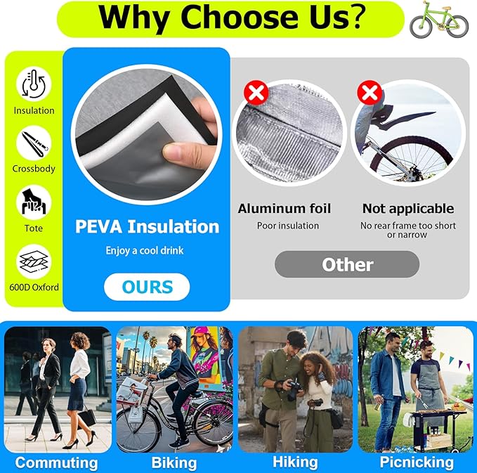 - 👍 Humanized Portable Design - The top reinforced hand strap and detachable shoulder strap realizes dual-mode carrying. And the quick-release hook&loop fastener straps system is compatible with the rear rack of mainstream bicycles. Installation and removal can be completed in 5 seconds, meeting the "bike-hand-carry-shoulder" multi-scene switching.