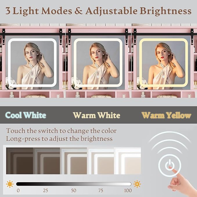- 【3 Lighting Modes & Brightness Adjustable】This make up vanity features a large LED mirror with 3 color modes (warm; natural; cool), which is safer than ordinary light bulbs. You can change the color mode by pressing the touch switch, or adjust the brightness by long-pressing the touch switch