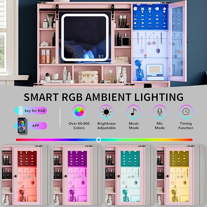 Makeup Vanity Desk with Sliding Mirror and Lights, Farmhouse Vanity Table Set with Power Outlet & RGB Cabinet, Dressing Table with Storage Drawers & Shelves for Kids Girls Women Bedroom, Pink