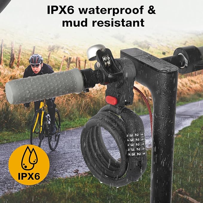 - Upgraded Scooter Lock : This electric scooter bike combination lock is made of 12 high strength steel cables 0.472 inches thick and 4 feet long, cut-resistant, with scratch and deformation-resistant PVC holster on the outer layer, 5-digit code, strong and durable compared with other combination locks, safe and reliable, which is the best choice for your travel