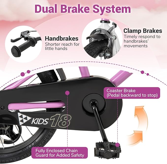- Dual Brake System: Safety is our top priority, which is why our kids' bike features a dual brake system and a fully enclosed chain guard to prevent accidents and keep your child's clothes snag-free. The handbrakes are specially designed for little hands, while the coaster brake allows for easy stopping without the need for handbrakes.