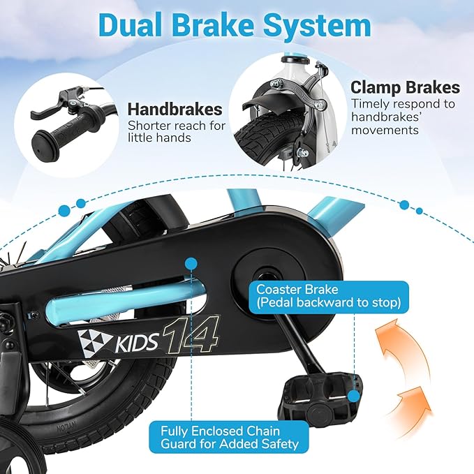 - Dual Brake System: Safety is our top priority, which is why our kids' bike features a dual brake system and a fully enclosed chain guard to prevent accidents and keep your child's clothes snag-free. The handbrakes are specially designed for little hands, while the coaster brake allows for easy stopping without the need for handbrakes.