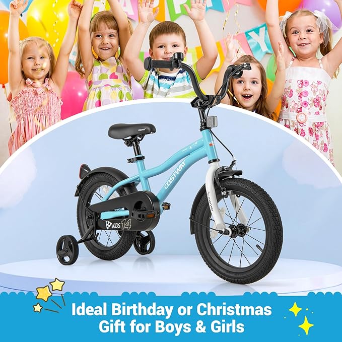 COSTWAY 12/14/16/18 Inch Kids Bike, Children Toddler Bicycle with Training Wheels, Adjustable Seat & Handlebar, Handbrake & Coaster Brake, Reflectors, Bell, Suitable for 3-8 Years Old Boys Girls