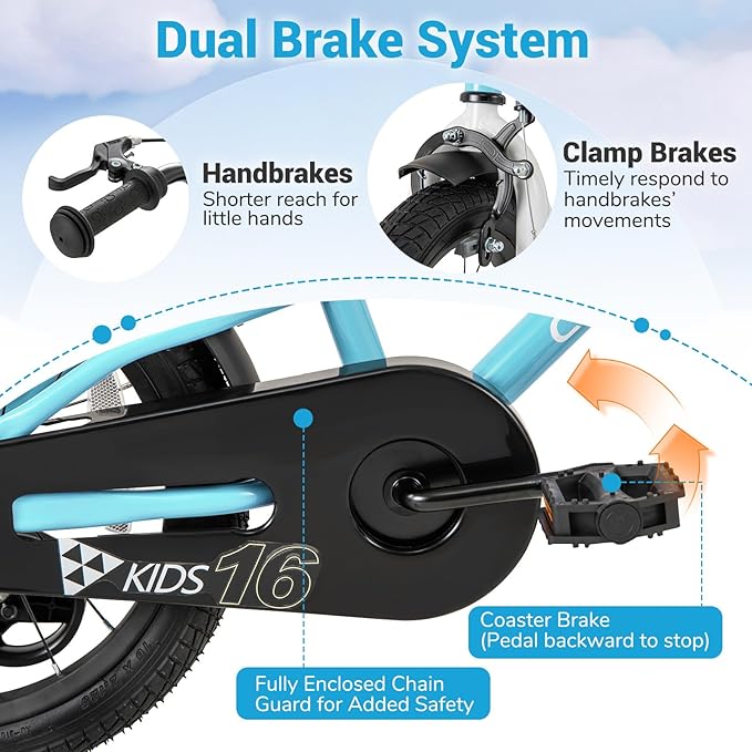 - Dual Brake System: Safety is our top priority, which is why our kids' bike features a dual brake system and a fully enclosed chain guard to prevent accidents and keep your child's clothes snag-free. The handbrakes are specially designed for little hands, while the coaster brake allows for easy stopping without the need for handbrakes.