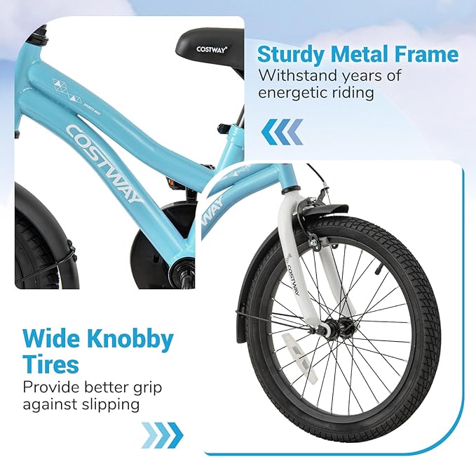 - Reliable Construction: Our kids' bike is crafted with a sturdy metal frame to withstand years of energetic riding. The wide knobby tires enhance grip and reduce bumps, making rides smoother on a variety of surfaces. Plus, reflectors on the front, rear, and wheels increase visibility for safer evening rides. 18 inch kids bicycle with kickstand provides extra convenience.
