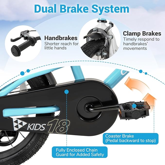 - Dual Brake System: Safety is our top priority, which is why our kids' bike features a dual brake system and a fully enclosed chain guard to prevent accidents and keep your child's clothes snag-free. The handbrakes are specially designed for little hands, while the coaster brake allows for easy stopping without the need for handbrakes.