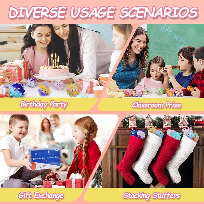 - CUTE FIDGET BALL FOR ALL SCENARIOS: Suitable for birthday party favors,classroom prizes,bulk fidget toys,treasure chest,treasure box,carnivals prize boxes toys,pinata fillers,stocking stuffers,party supplies,school classroom rewards,goodie bag stuffers,pinata stuffers,sensory toy bulk,fidgets toys pack.If you have any questions about the product, please contact us!