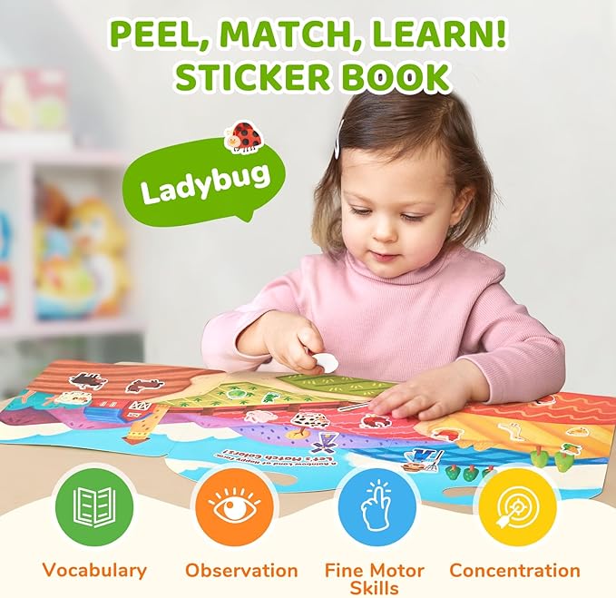 - Great Study Partner: More than fun, this sticker book supports early learning! It helps toddlers and preschoolers learn vocabulary, recognize objects, and build understanding. Engaging with stickers encourages creativity, self-expression, independence, and develops fine motor skills, hand-eye coordination, and concentration. Themed scenes spark imagination and storytelling, making it a valuable resource for classrooms and home, offering screen-free play