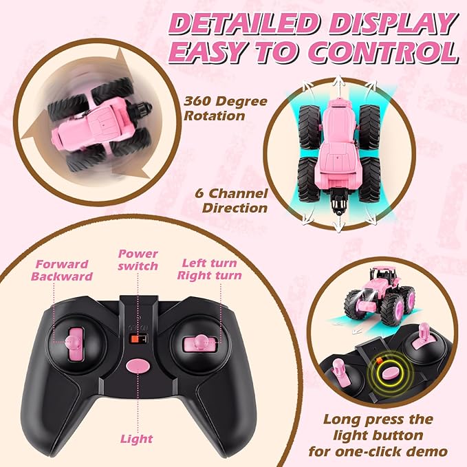 - Pink Remote Control Monster Tractor Toy:This RC tractor, designed with a cool monster truck look, delights kids aged 3+. It features 360° rotation for thrilling stunts, and glowing wheels simulate real lighting for an immersive experience. Meticulously crafted details enhance impact during collisions and maneuvers. The high-quality 2.4GHz remote enables 6-directional control (including 360° spins), while the one-button demo function lets kids easily showcase its capabilities.