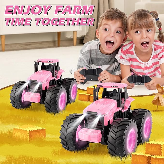 Remote Control Monster Tractor Toy for 3, 4, 5, 6, 7 years old, Pink Light Up Monster Trucks Toy with LED Lights Toddlers RC Farm Vehicle Toys for Boys & Girls Ideal Christmas, Birthday Gifts for Kids