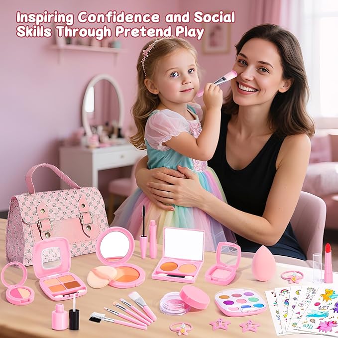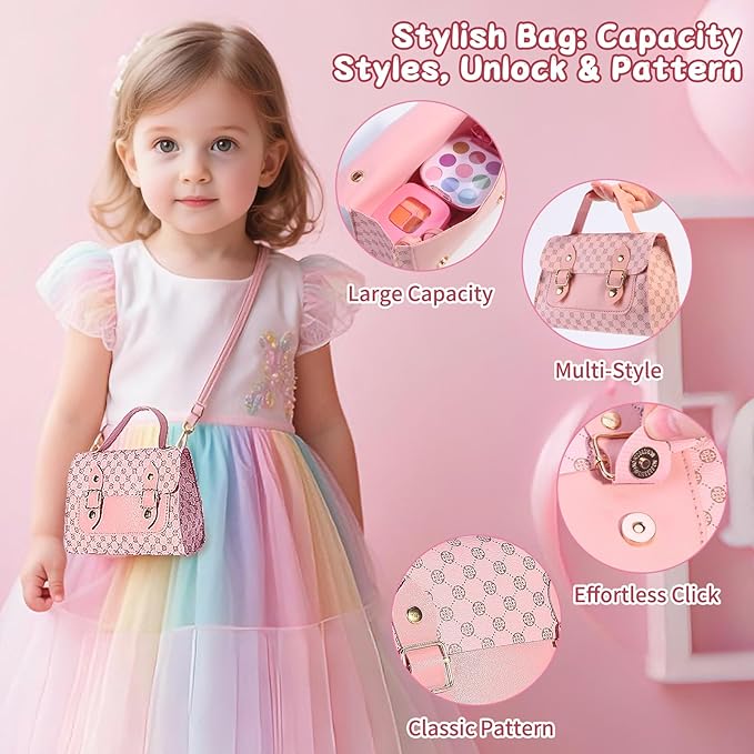 - CUTE TODDLER PURSE: Includes a stylish pink-patterned little girl purse. It's not only convenient for organizing all the girl makeup pieces but also easy for kids to carry around. Whether for home play or trips, it keeps the makeup set for girls neat and portable.
