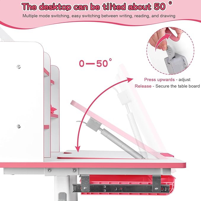 - 🎨【Adjustable Desktop Tilt for Creative Comfort】The smaller desktop tilts from 0° to 50°, allowing your child to paint, draw, or use the computer with ease. Ideal for hours of creative play and learning without strain.