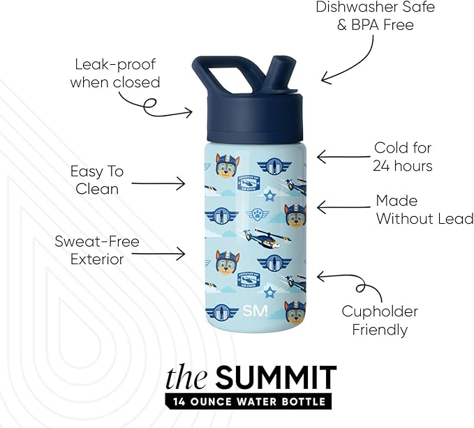 Simple Modern Kids Summit Water Bottle with Straw Lid | Paw Patrol 14oz Stainless Steel Cup Insulated Tumbler for Toddlers, School | Helicopter Chase