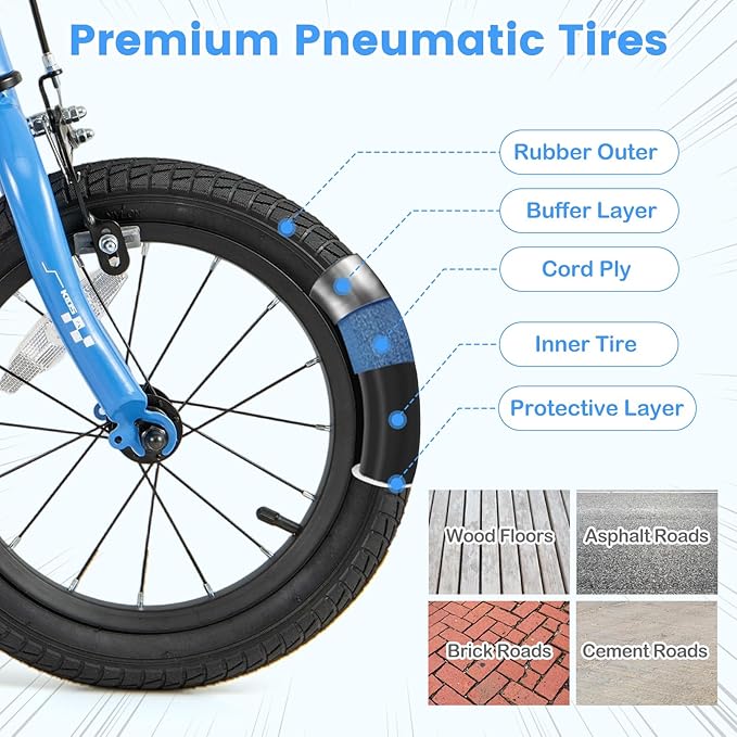- Pneumatic Tires & Training Wheels: The wide pneumatic tires are built for durability and traction, offering a smooth ride on various surfaces including wood floors, asphalt roads, brick paths and cement sidewalks. The detachable training wheels offer stability for beginners and can be removed as your child's cycling skills improve.